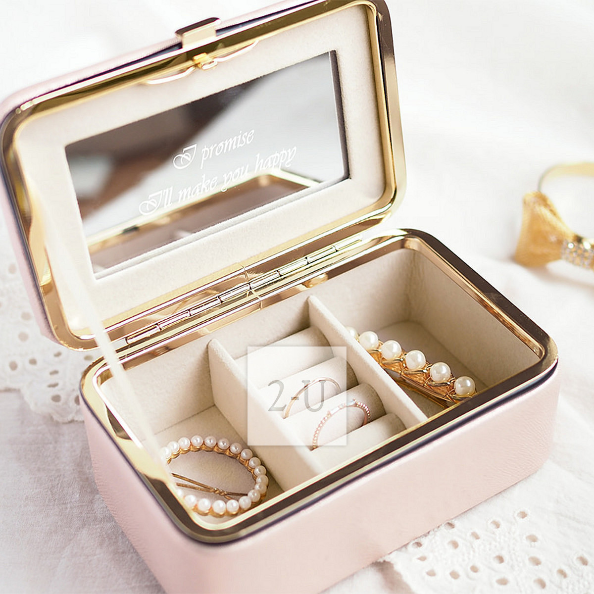 首饰盒的外形设计略呈圆滑,很有女人味。打开后有一圈金属镶边装饰显得高档。整个首饰盒大小适中,便于携带,适合旅行、宴会、外出用等。