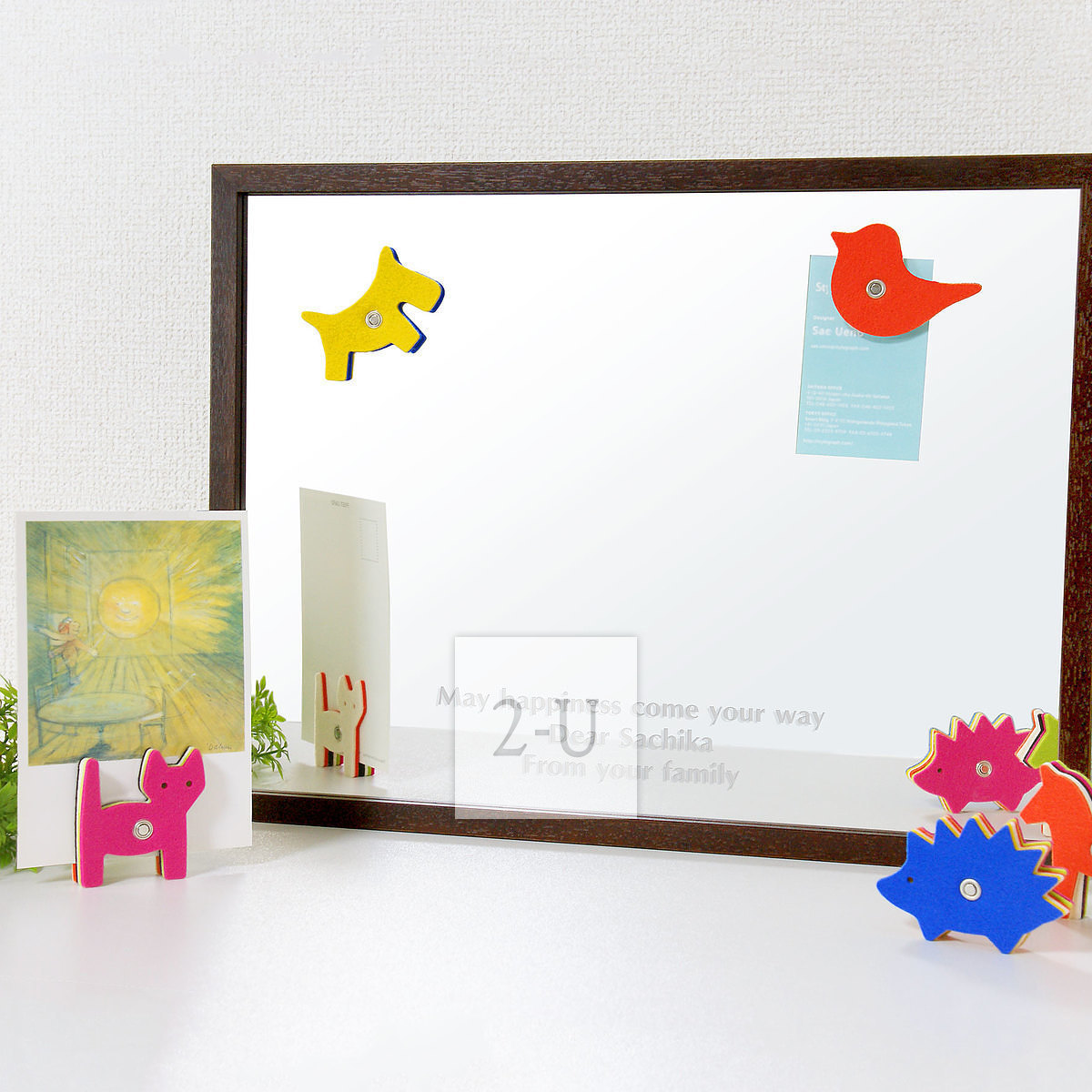 镜子部分全部带磁铁、所以可以非常方便的当作留言板、装饰镜使用。在镜子上可以吸上各种自己喜欢的小物品镜子就可以成为别致的家居装饰物。还可以吸附上留言条、让 TA 在照镜子的时候看到留言给生活带来便利和情趣。