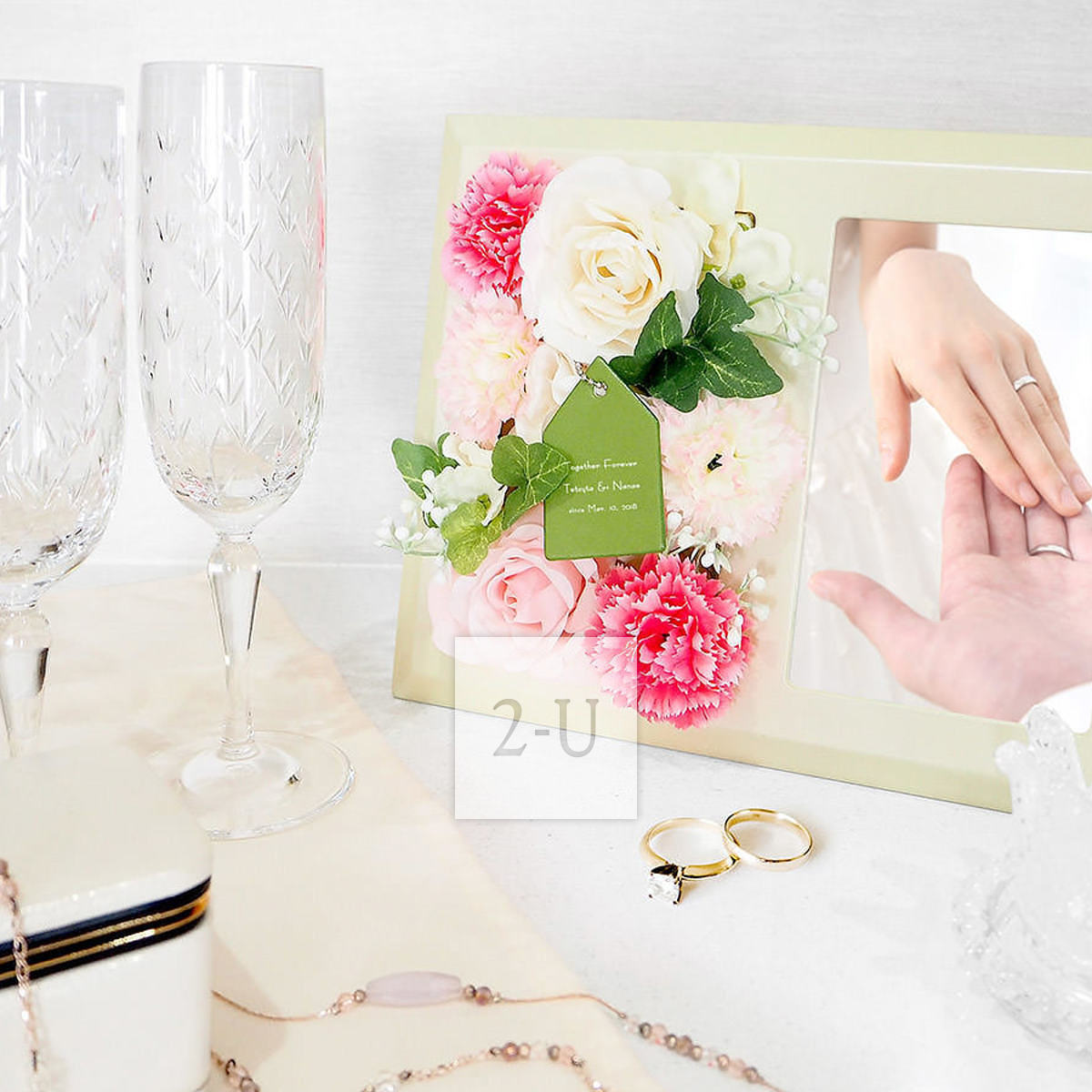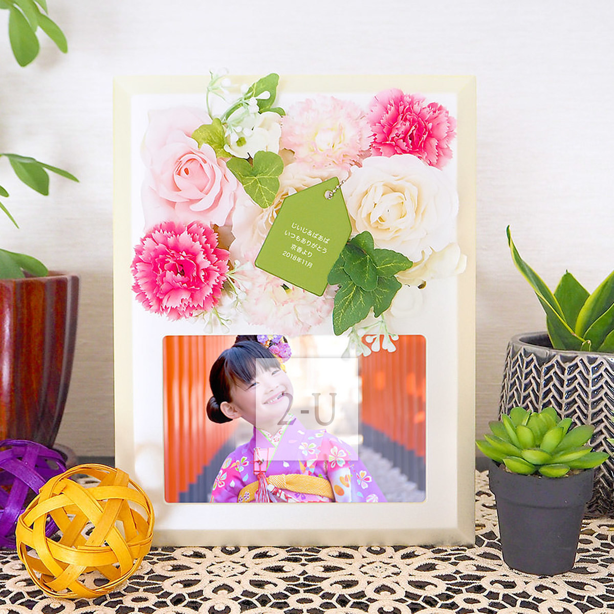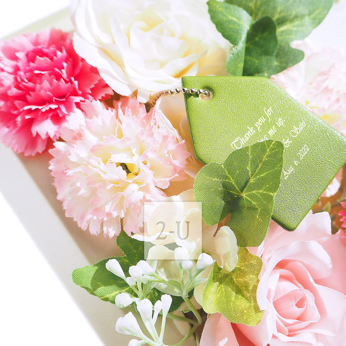 在花团锦簇中的锦上添花的合成皮革标签上可以印上祝福语和重要纪念日。这会是一个让人每次看见都能够有美好回忆的相架。